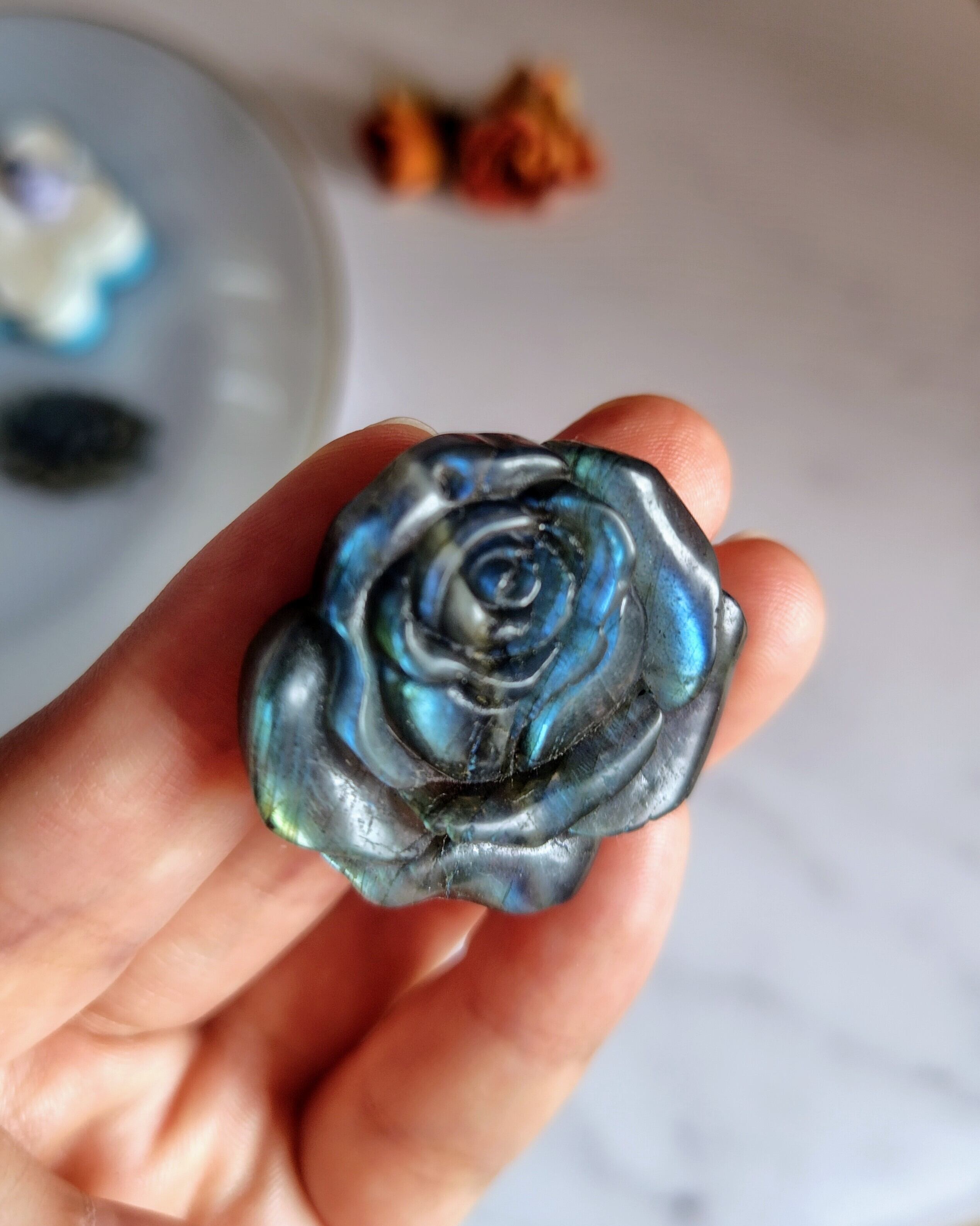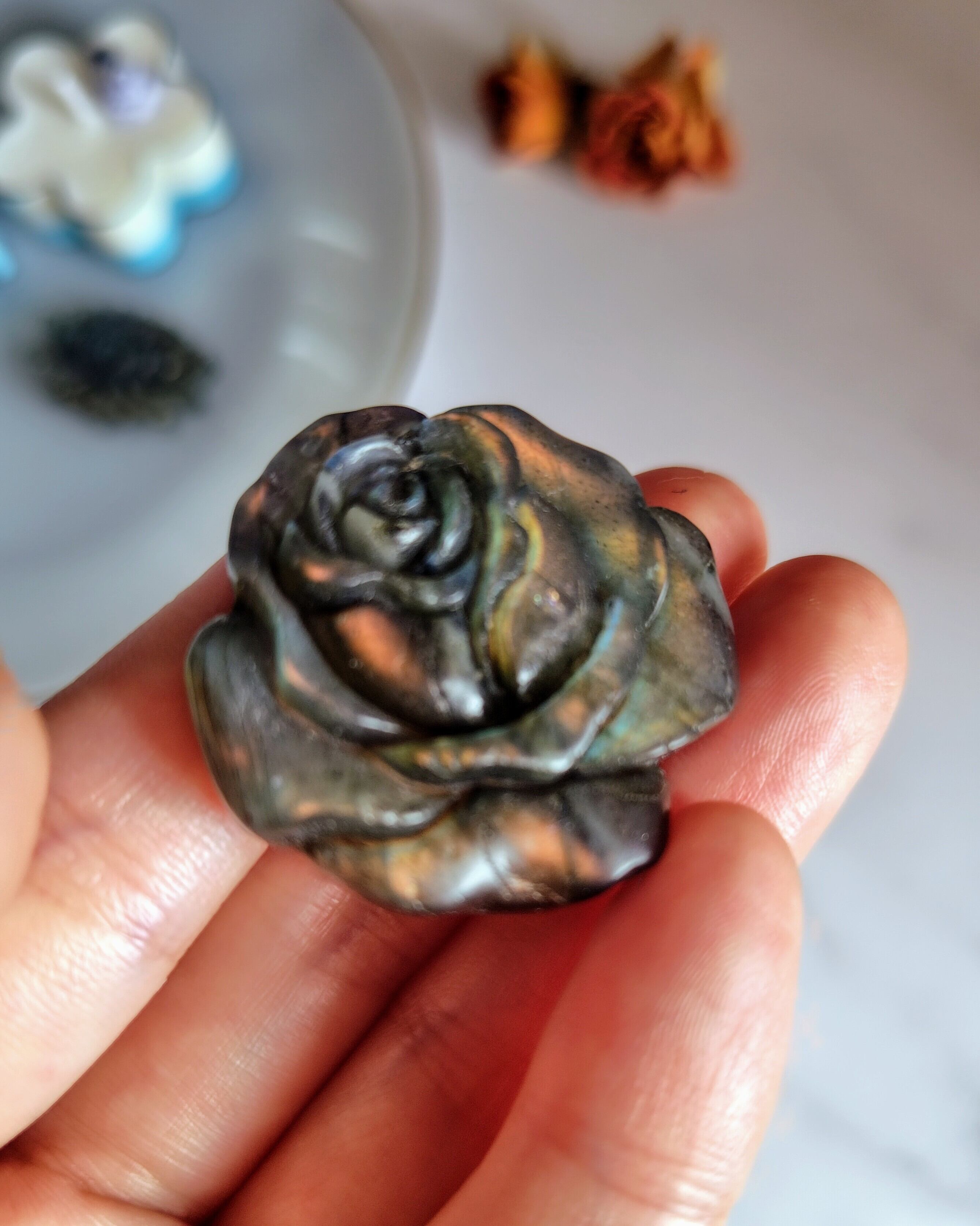 ラブラドライト(ブルーフラッシュ)薔薇の花:横約3.5㎝×縦約3.5×厚み約1cm(最大値) 重さ:約14.5g