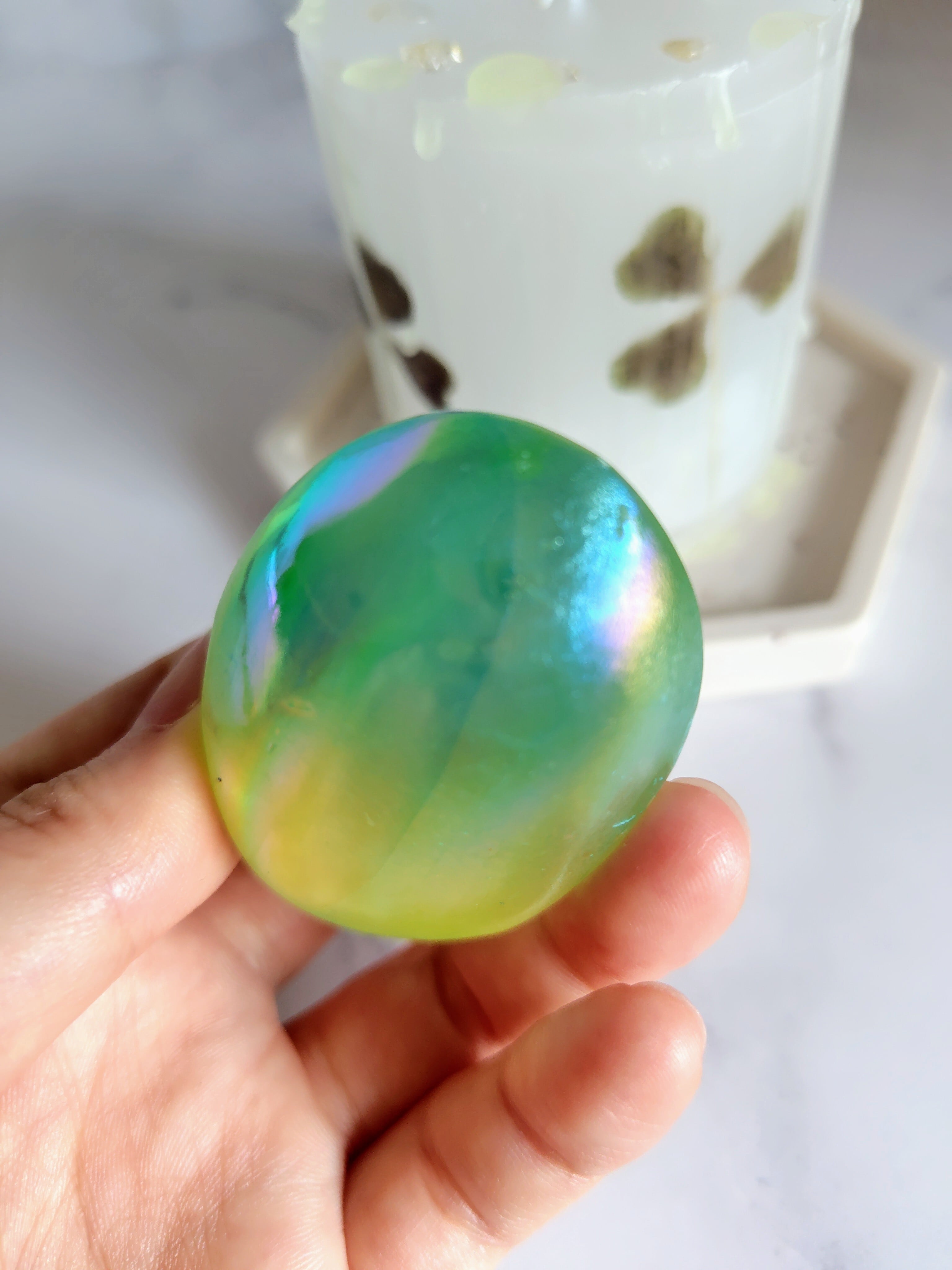 こちらは、グリーンとスカイブルーとイエローのグラデーションオーラが綺麗な特別なセレナイトのパームストーンと