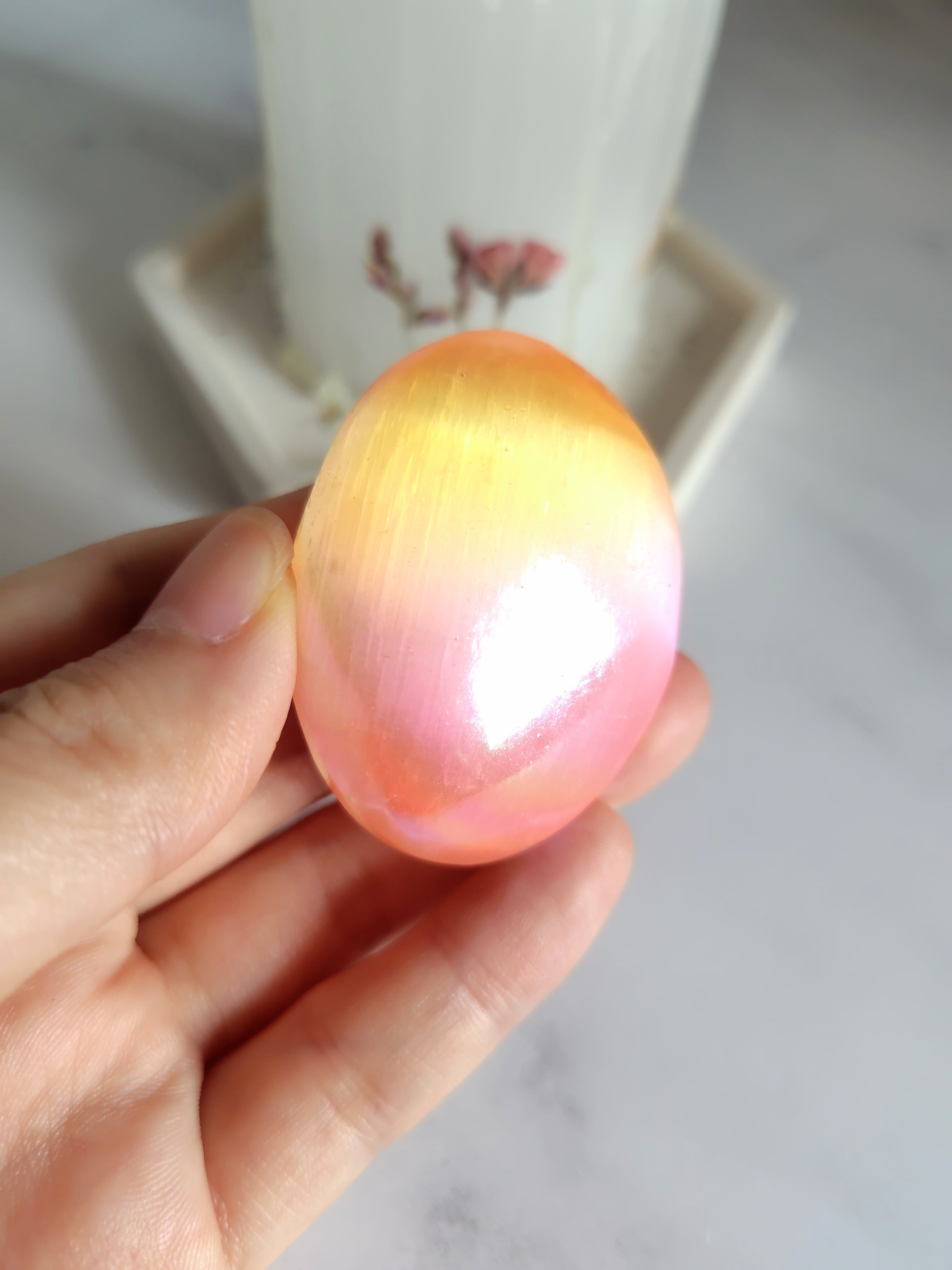 こちらは、オレンジとピンクとイエローのグラデーションオーラが綺麗な特別なセレナイトのパームストーンと