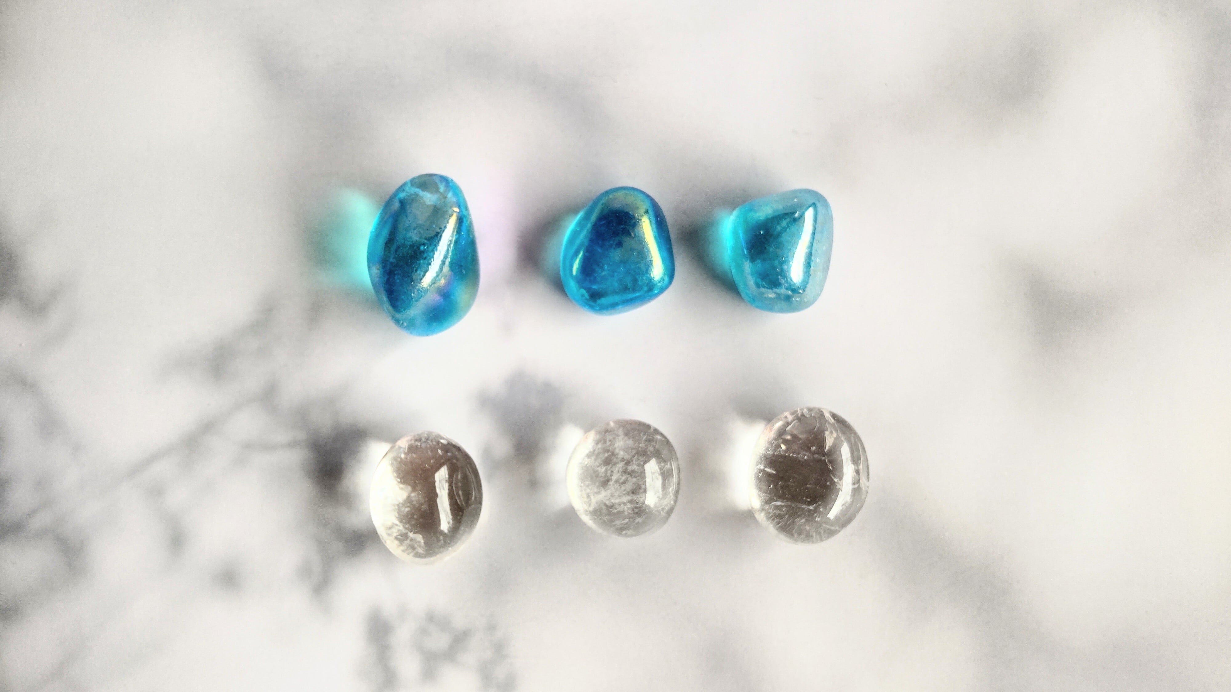 透き通った透明度に高いクリアクォーツ(3個)とアクアオーラ(3個)のタンブルセットです。