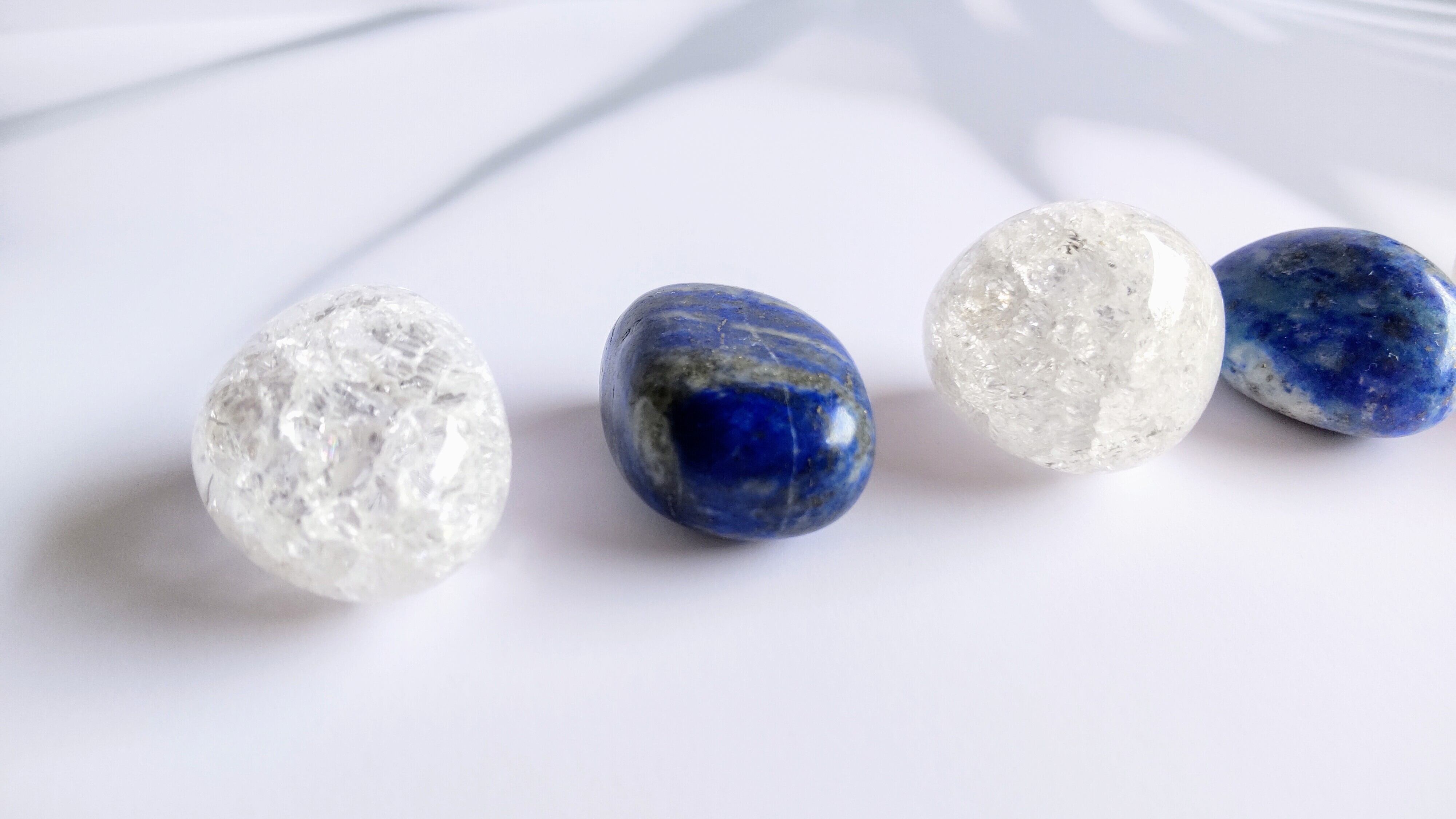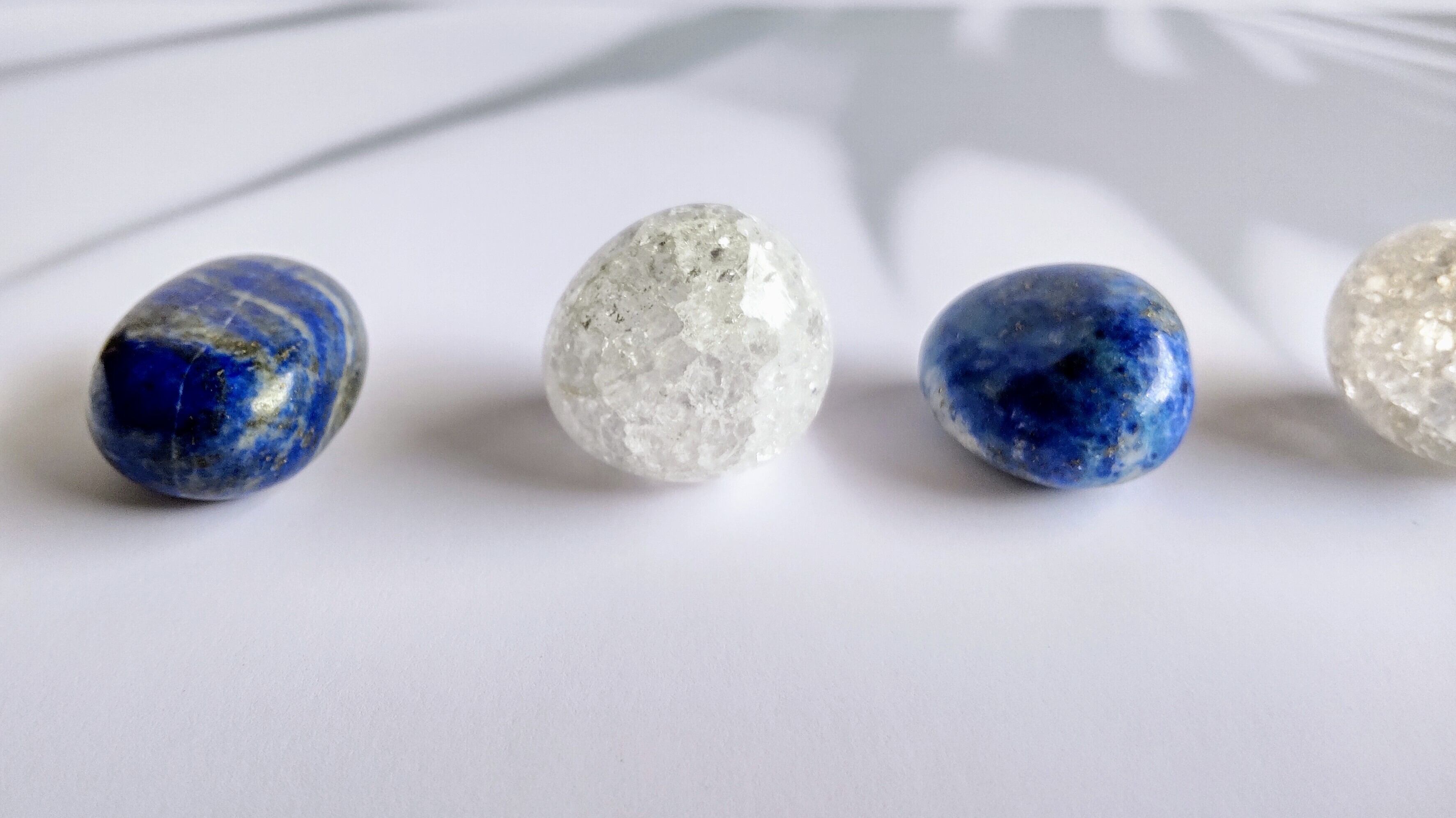 不要な観念を取り払い、直感力を高めるラピスラズリ(3個)とクラックが沢山入ってずっと眺めていられる神秘さと面白さをもった店主お気に入りのクラック水晶(3個)のセットです。