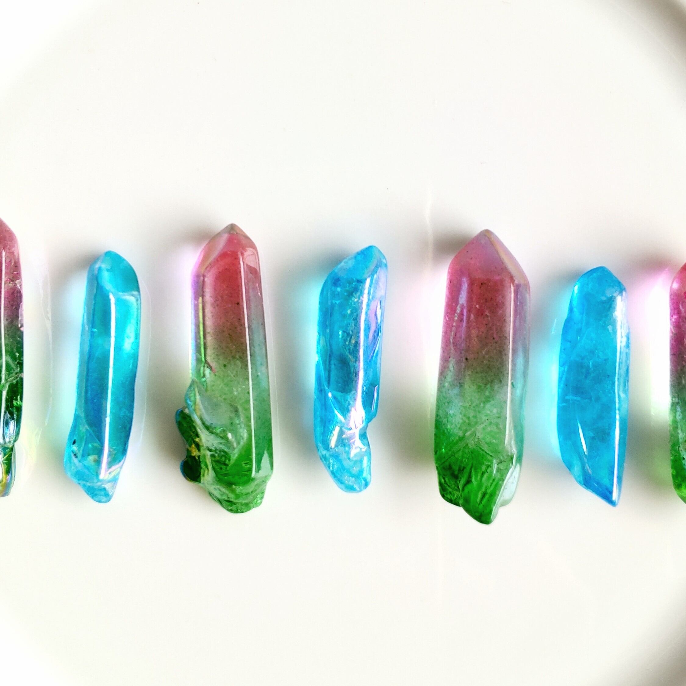感覚を研ぎ澄ますアクアオーラクォーツ(3本)とピンク~グリーンのオーラは、若さと美しさ、心を浄化し癒すオーラクォーツ(4本)のミニポイントセットです。