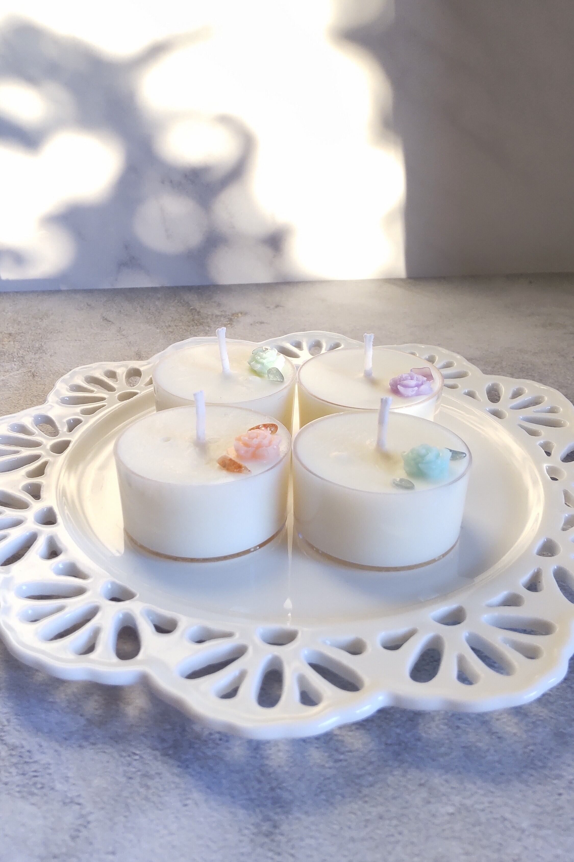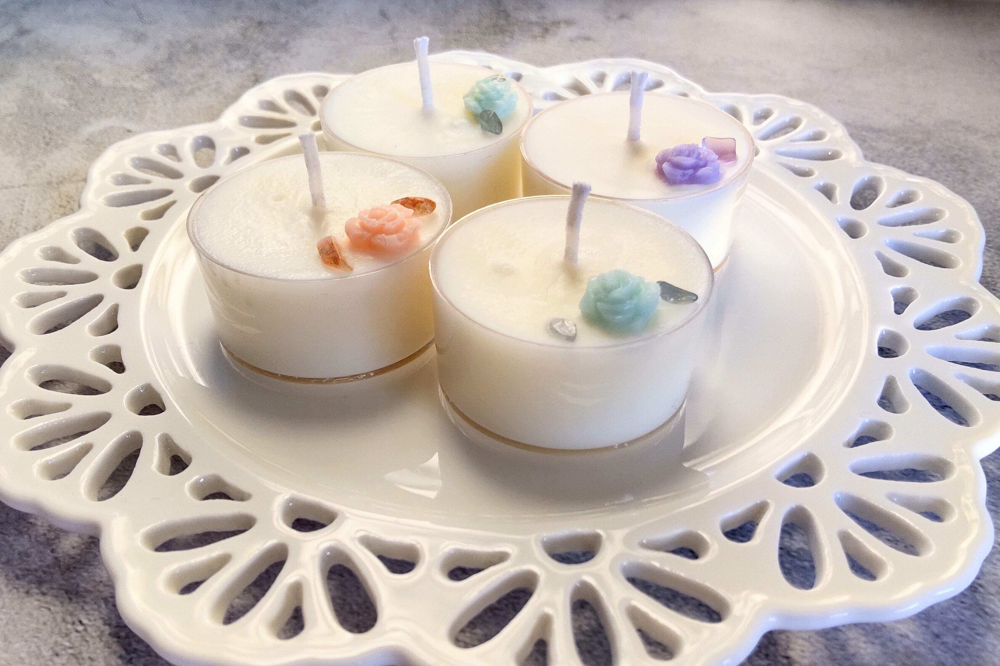 とっても可愛いティーライトキャンドル。ソイワックスキャンドルにお花と天然石を添えて。