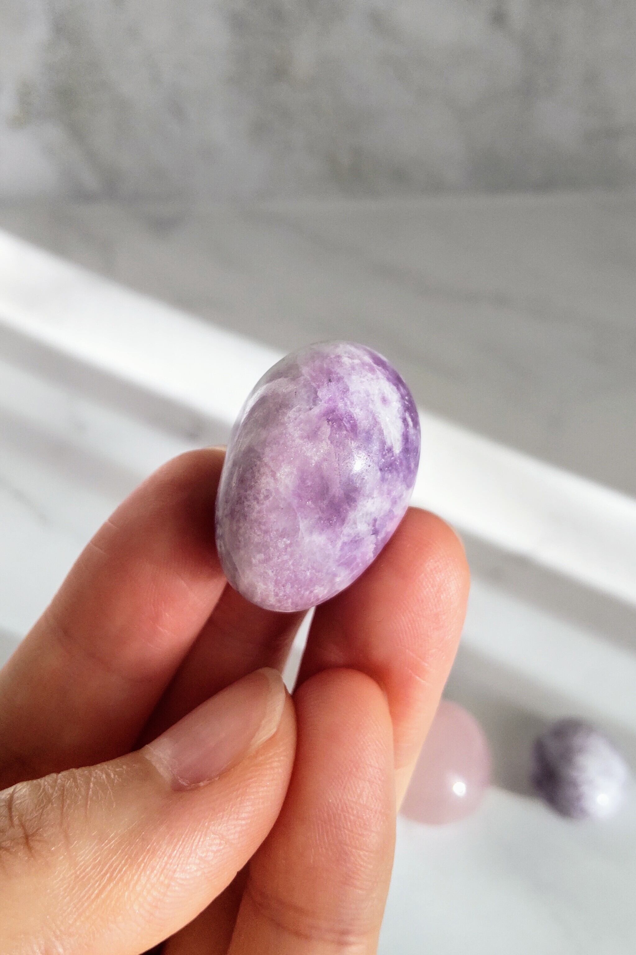 ローズクォーツのタンブル(3個)とレピドライトのタンブル(3個)のセットです。