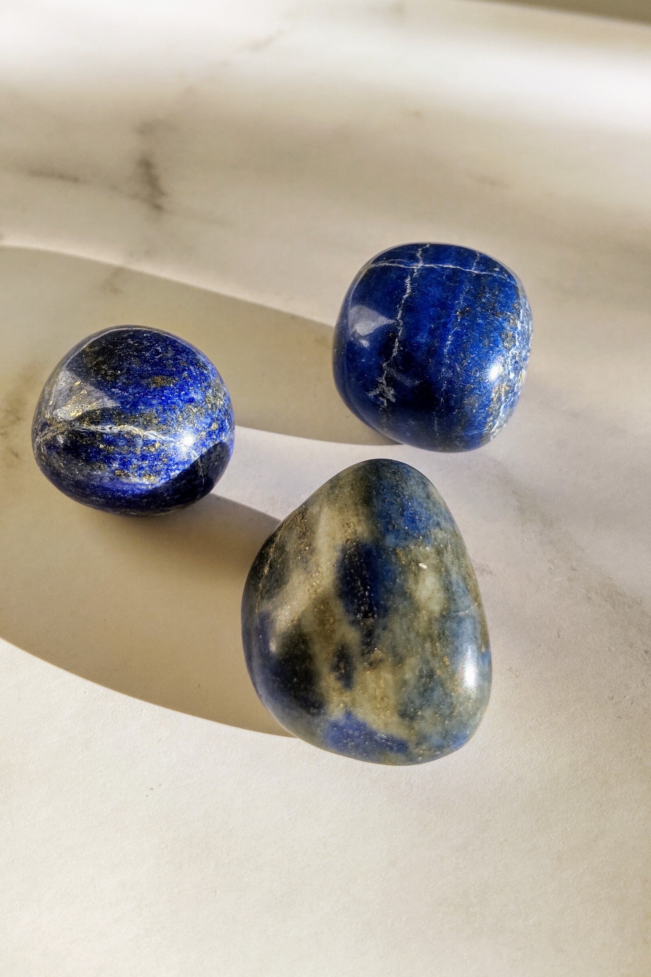 ラピスラズリのタンブル(3個)とアメジスト原石(3個)のセット。