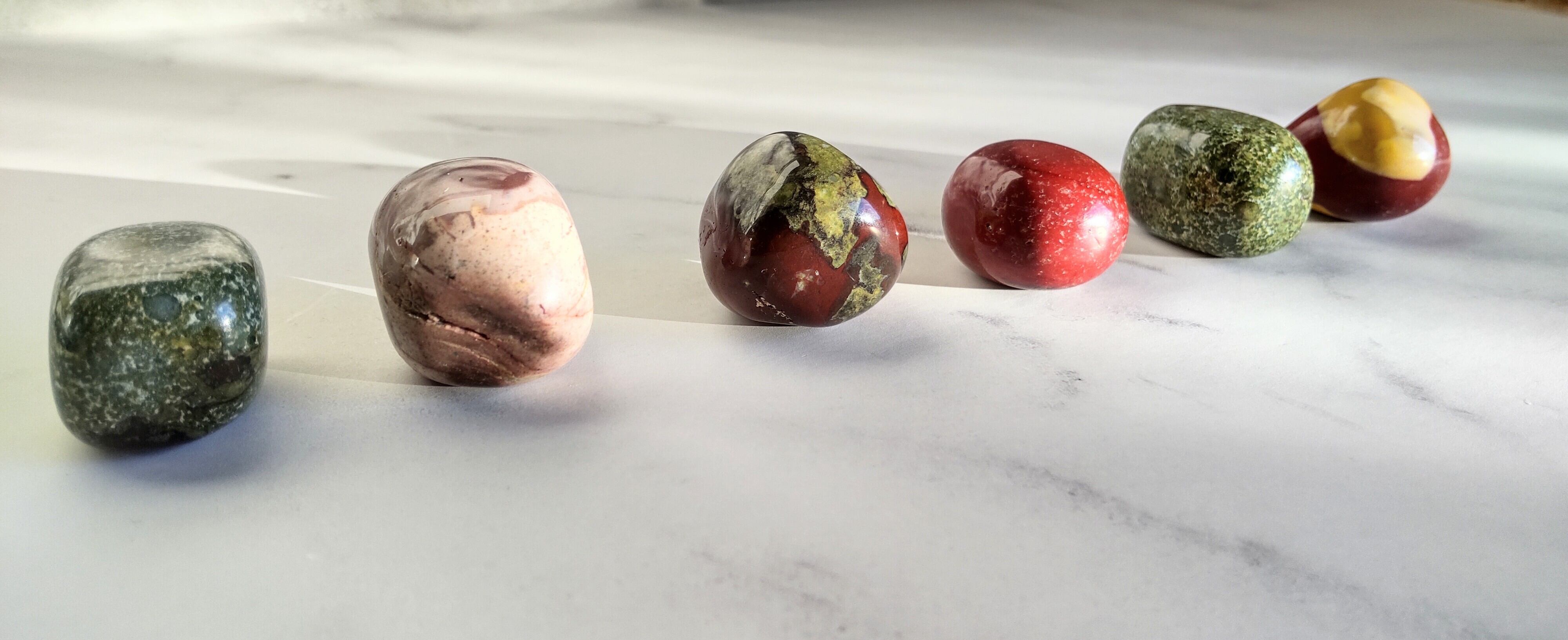 ドラゴンブラッドジャスパーのタンブル(3個)とムーアカイトのタンブル(3個)のセットです。